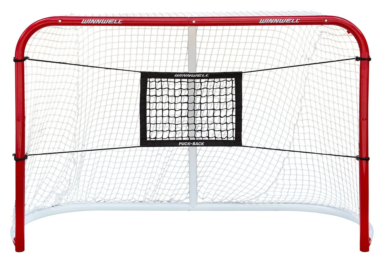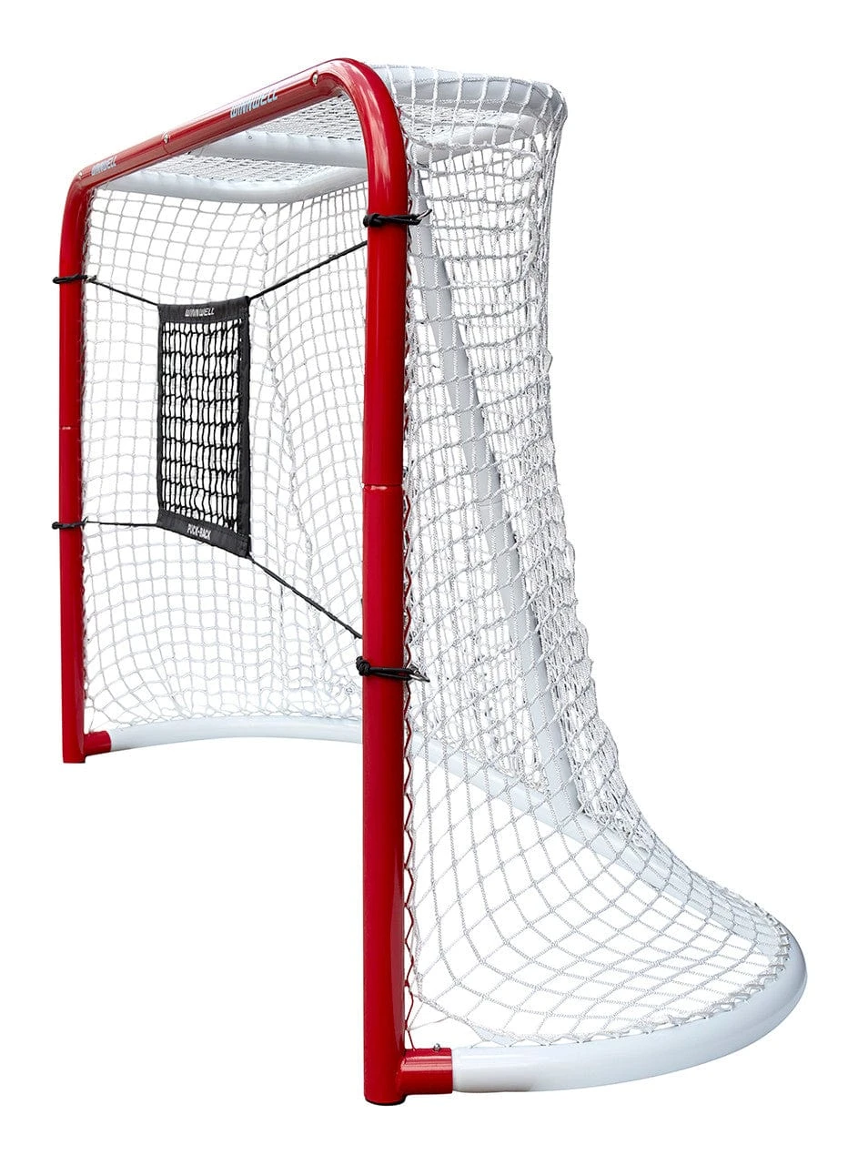 Keep shooting with the Hockey Canada Puck-Back Target by Winnwell. The target allows for continuous play, improved accuracy, and improved reaction time by forcing them to react quickly and shoot again. This quick rebound feature helps players improve their reaction time and shot speed. The set-up is simple – just loop the four cords around the net and fasten them with the metal clips.